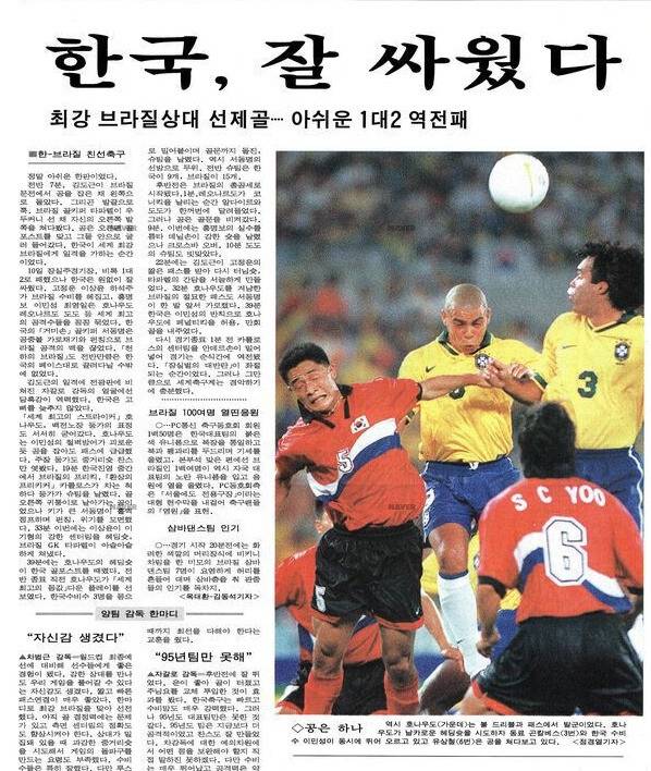 브라질의 라인업은 더욱 화려했다. 둥가, 레오나르두는 물론이고, 호나우두와 호베르투 카를로스, 데니우손 등이 모두 출전했다. 이를 상대로 한국은 전반 7분 김도근의 강력한 슈팅으로 앞서나갔다. 이후 한국은 후반 39분까지 리드를 지켰다. 다만 후반 39분 페널티킥으로 동점골을 내줬다. 그리고 경기 종료 1분전 안데르손에게 역전골을 허용하며 패배했다. 잠실벌의 대반란이 좌절되는 순간이었다.