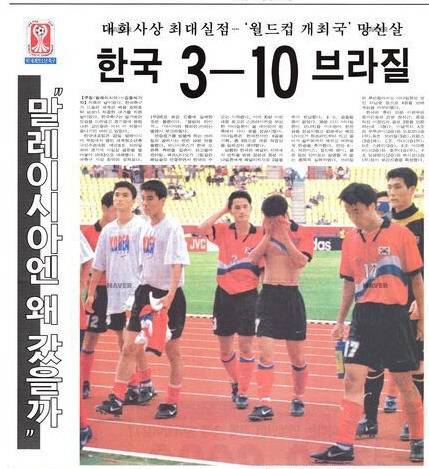 여담으로 브라질은 우리에게 대패의 아픔도 선사한 적이 있다. A대표팀은 아니다. 20세 이하 대표팀에서 브라질을 상대로 10골을 내준 적이 있다. 때는 1997년 6월 22일이었다. 당시 박이천 감독이 이끌던 한국은 1997년 세계 청소년 축구대회(현재 20세 이하 월드컵)에 나섰다. 1승 상대였던 남아공을 잡지 못했다. 0대0으로 비겼다. 2차전은 프랑스. 당시 경기에서 한국은 프랑스 소속이던 티에리 앙리와 다비드 트레제게에게 각각 2골씩 내주며 2대4로 졌다.