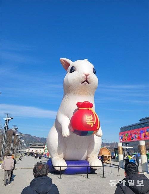 대형 복주머니를 들고 한발 앞서 인사 온 토끼. 내년은 ‘검은토끼해’, 한 해 잘 지내 보자고.