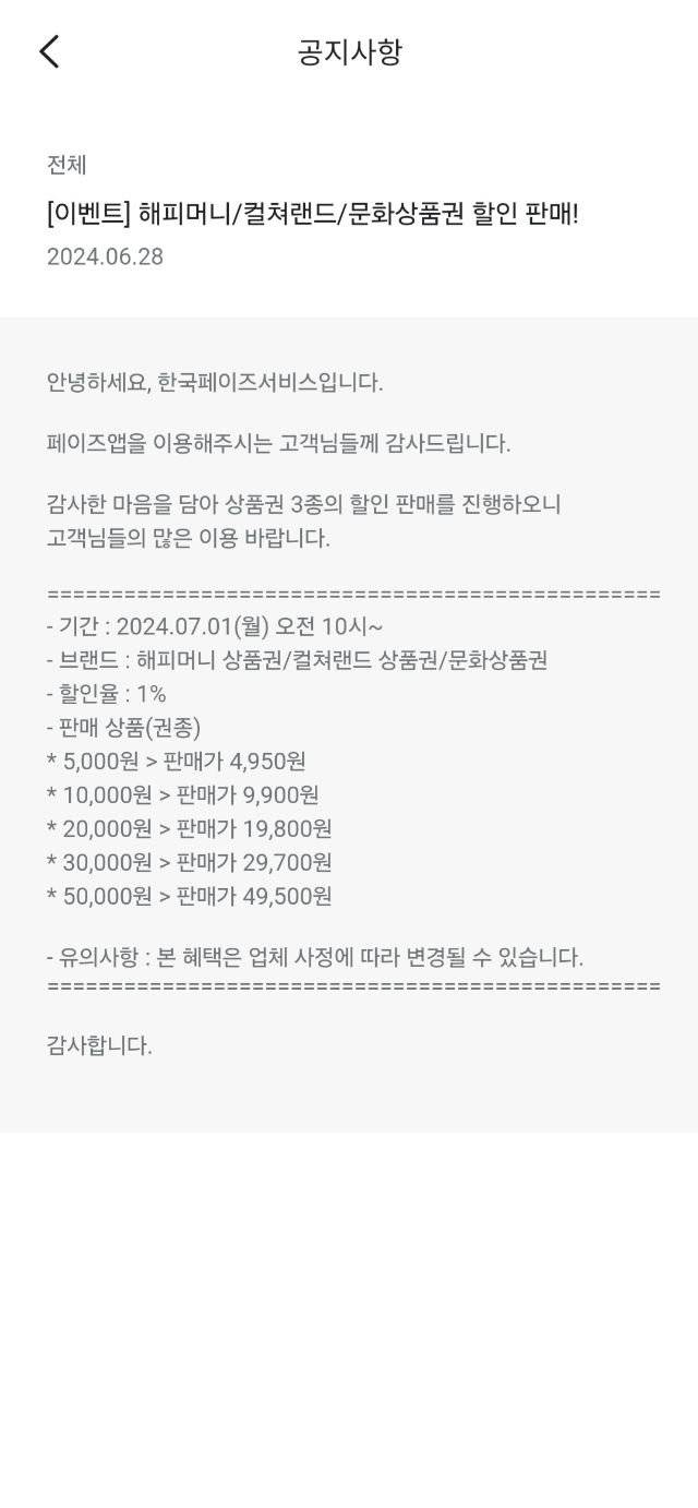 페이즈앱에서 7/1부터 해피, 컬쳐, 문상 1% 할인판매 하네요
