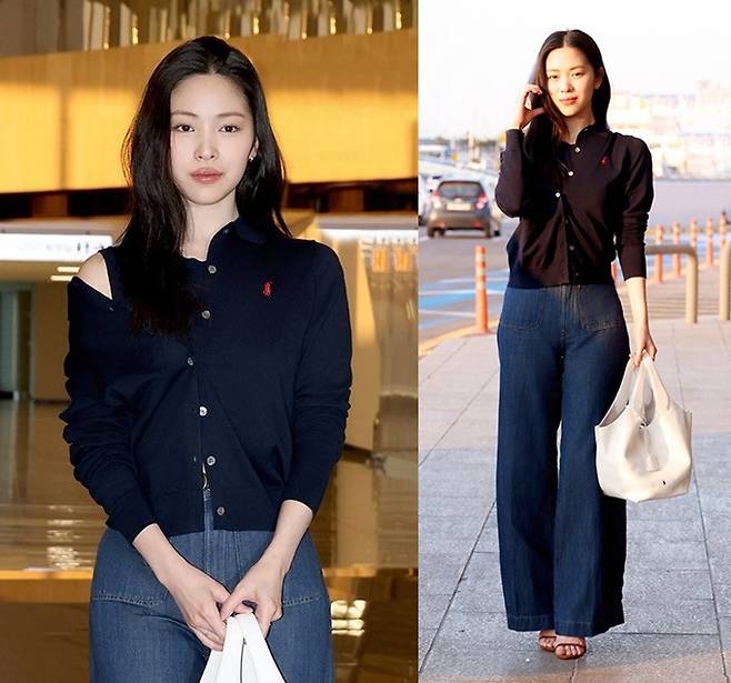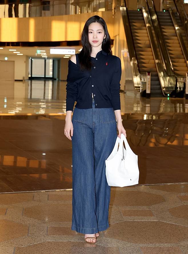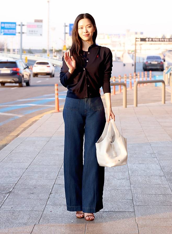 류진은 이날 출국길에서 한쪽 어깨라인이 절개된 컷아웃 블랙 카디건과 슬리브리스 크루넥 스웨터를 매치해 클래식하면서도 세련된 봄의 기운을 가득 담은 공항패션을 선보였다.