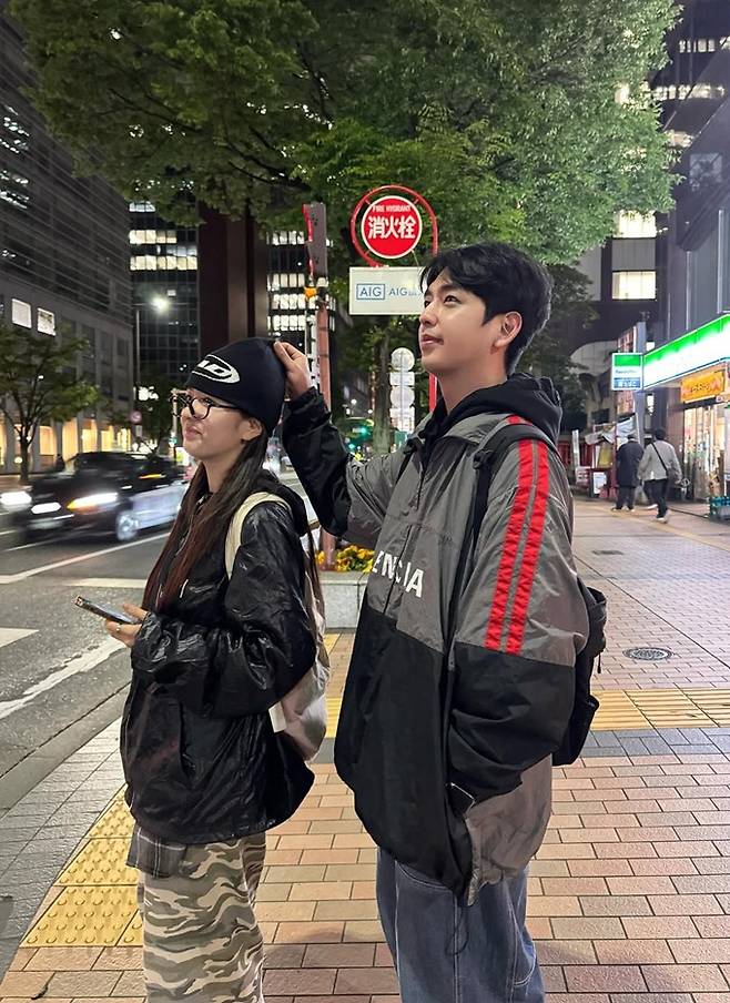 공개한 사진에서 윤보미는 밀리터리 카고 팬츠와 캐주얼한 티셔츠에 레더 재킷을 입고 비니를 걸친 힙한 스타일을, 남동생은 또한 데님 팬츠에 집업 바람막이 집업 재킷을 착용한 여행 스타일로 힙한 커플룩을 선보였다.