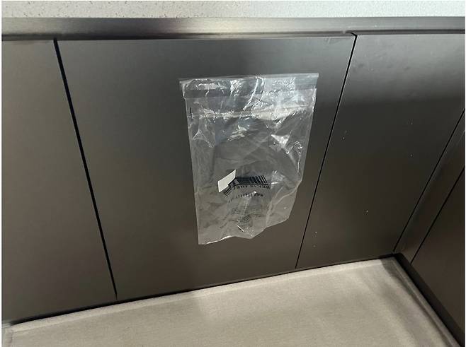 포장비닐의 접착 부분을 이용해 책상 옆에 붙여 주세요