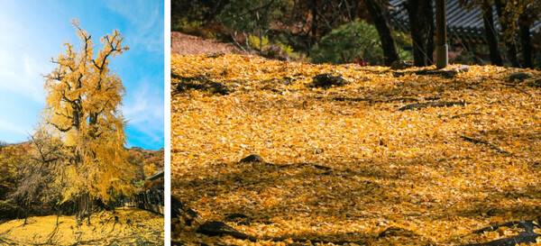 현재 천연기념물로 지정된 은행나무는 총 25그루로 절은 물론 동네 어귀를 지키는 수호신으로 불리기도 하는데요. 은행나무는 매년 이맘 때 쯤에 한번만 황금색 잎비를 내립니다.