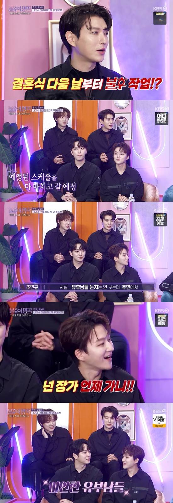 이를 듣던 MC 이찬원은 "기혼자가 두 명인데 팀 분위기에 변화가 생겼냐"고 궁금해했고, 조민규는 "사실 유부남들 눈치는 안 보는데 주변에서 '넌 장가 언제 가냐'고 계속 묻더라"라고 나름의 고충을 토로했다.