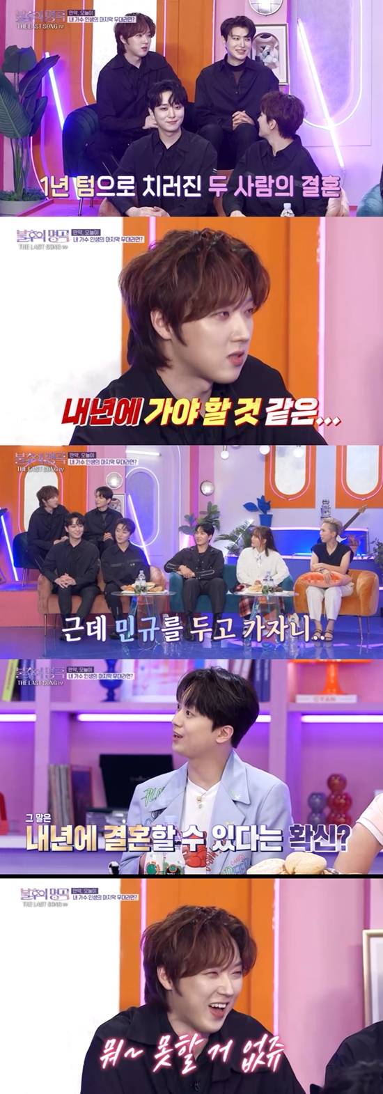 또한 이찬원은 또 다른 미혼 멤버인 강형호의 심경을 물었다. 이에 강형호는 "막내가 (결혼) 스타트를 빨리 끊어서 1년 텀이니까 내년에는 제가 가야할 것 같은 느낌이 든다"며 "근데 또 민규를 생각하면 민규가 부담될 것 같다"고 같은 미혼 멤버인 조민규를 걱정했다.
