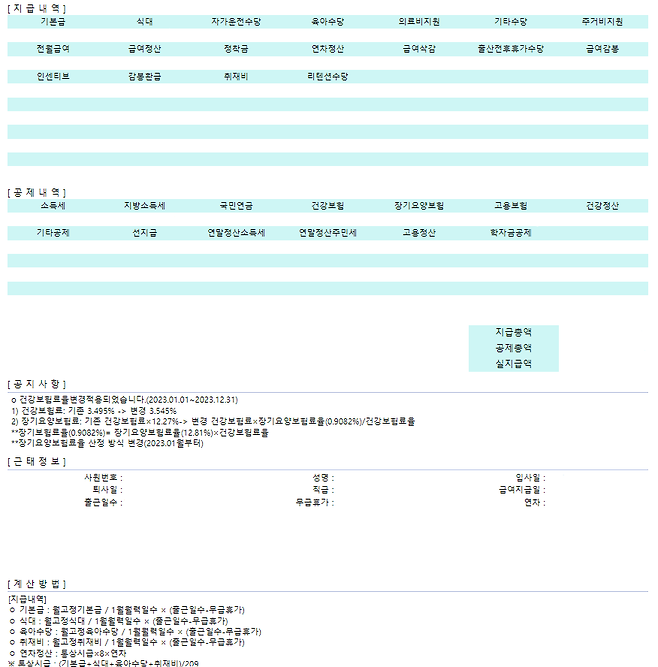 공제내역은 총 지급내역에서 각종 세금을 원천징수해 차감하는 항목이에요. 질병, 산재 등을 예방하기 위한 4대 보험(고용보험, 산재보험, 건강보험, 국민연금)과 소득에 부과되는 소득세, 거주 지역에 납입되는 지방소득세 등이 있습니다.
