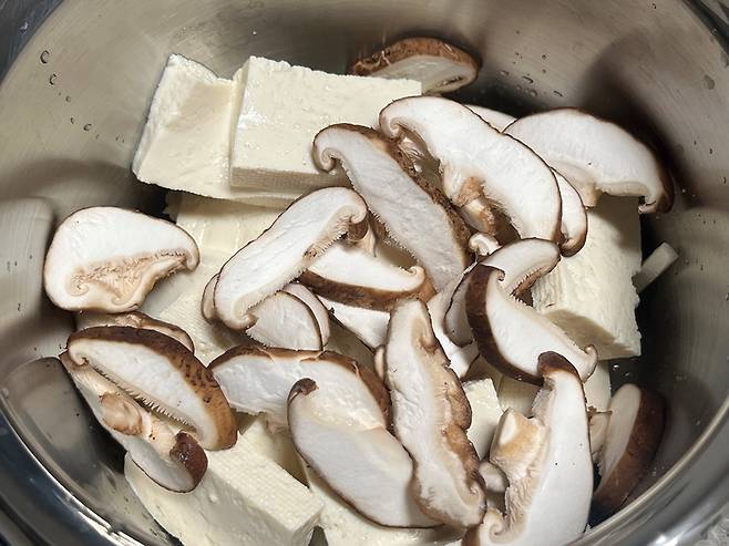 표고버섯은 기둥을 떼어내고 윗부분을 도톰하게 썰어서 넣어 주세요. 표고버섯에는 감칠맛을 내는 성분이 들어있는데, 버섯이 열을 받아 익는 과정에서 이 성분이 국물로 녹아 나와 마치 고기를 넣은 듯한 풍미가 더해집니다.