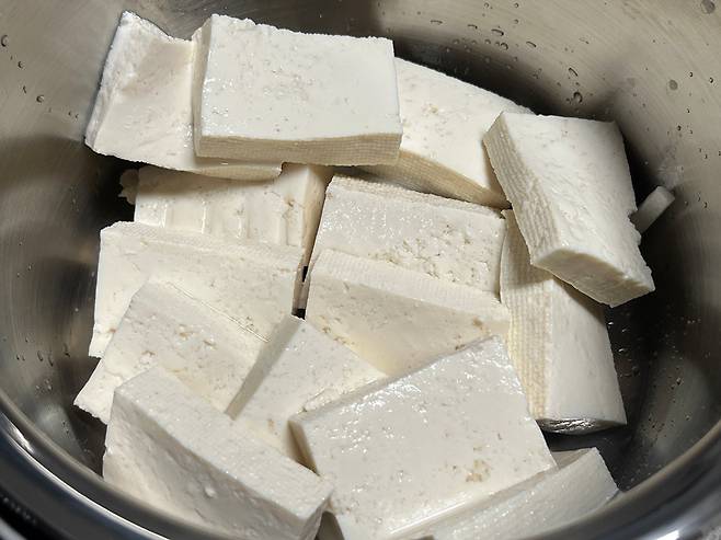 두부 1모는 물기를 최대한 제거한 상태에서 한 입 크기로 썰어 냄비에 담아 주세요. 달달한 맛을 더하고 싶다면 설탕 대신 양파를 반 개 정도 썰어서 넣으면 좋습니다.