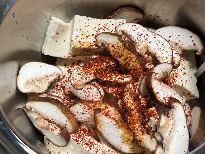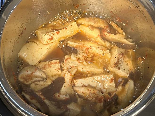 고춧가루 1스푼과 간장 3 스푼을 넣어서 간을 합니다. 만약 더 깊은 풍미를 원한다면 들기름 한 큰 술을 양념에 섞어보세요. 들기름의 고소함이 표고버섯의 향과 만나 국물 전체에 고급스러운 풍미를 입혀줍니다.