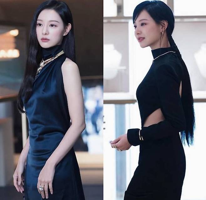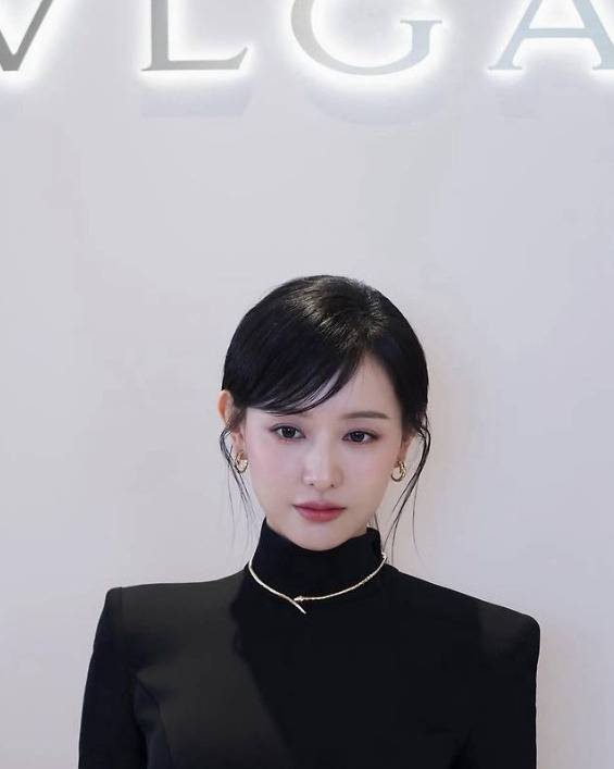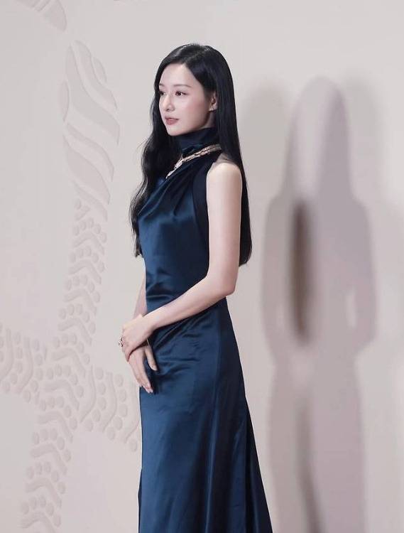 네이비 실크 드레스: 은은한 광택이 도는 네이비 실크 드레스로 우아함과 세련미를 동시에 잡았어요. 하이넥 디자인에 비대칭 주얼리 장식으로 포인트를 뙇! 긴 생머리랑 절제된 메이크업은 클래식한 분위기를 극대화했죠. 🥰