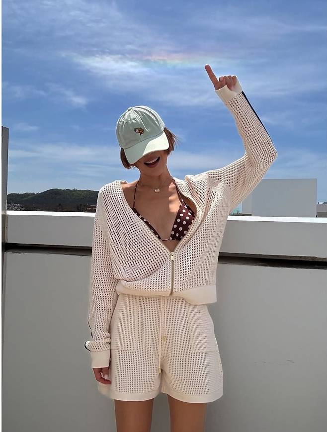 최은경은 바닷가를 배경으로 크로셰 소재의 시스루 화이트 니트 카디건과 팬츠를 세트로 맞춰 입고, 도트 패턴 비키니를 매치해 완벽한 바캉스룩을 선보였습니다.