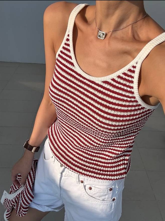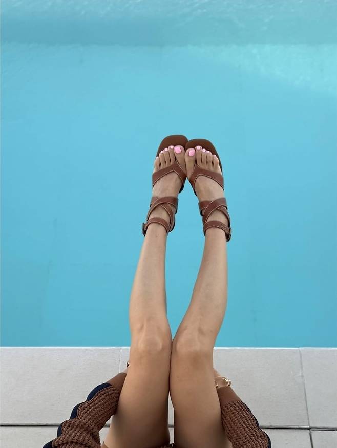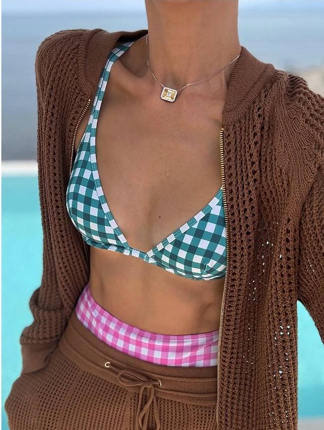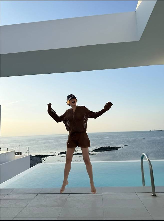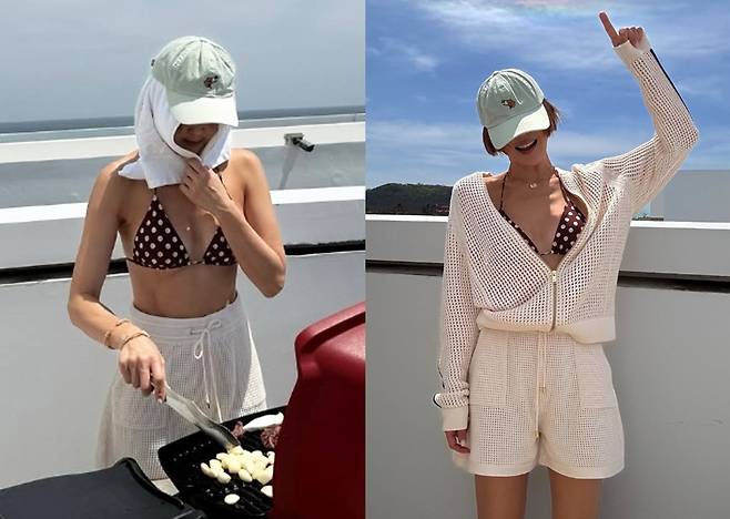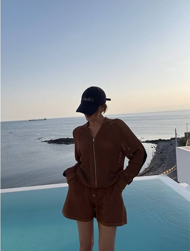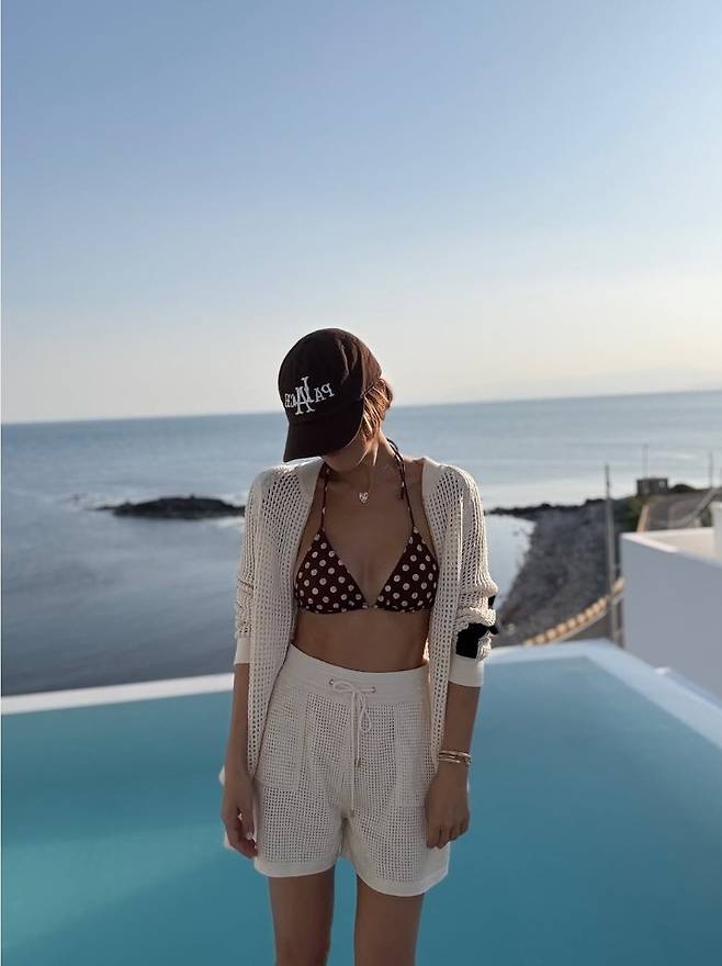 또 다른 컷에서는 초콜릿빛 브라운 컬러의 크로셰 셋업으로 룩을 체인지, 밝은 햇살 아래 시원한 포즈를 취해 인피니티 풀을 완전히 접수했습니다.