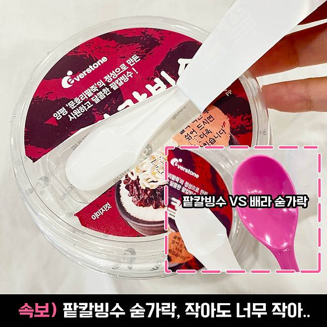 혹시 몰라 비슷한 다른 숟가락을 찾아보니 배스킨라빈스 숟가락이 있어서 비교해보니, 확연히 차이가 나는 거 느껴지실까요. 그리하여 밥심은 팥칼빙수 숟가락 대신 배라로 PICK.