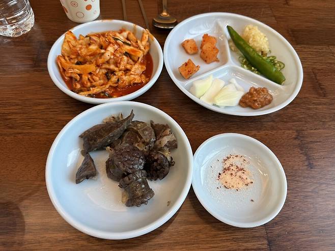 저 우측 위의 반찬은 가져다주시는거고 왼쪽의 빨간 무침과 순대는 알아서 가져다먹을 수 있는 반찬입니다