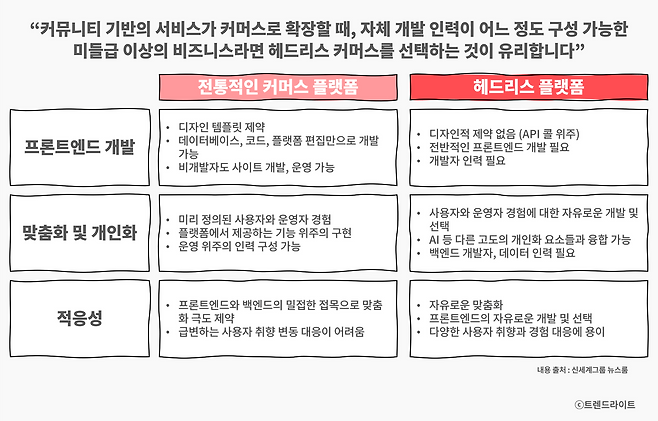 그래서 최근 각광받는 기술이, 쇼핑 기능을 갖춘 백엔드 기능은 붙이되, 고객이 실제로 사용하는 프론트엔드의 자유도는 높인 헤드리스 커머스입니다. 헤드리스 커머스란 프론트엔드와 백엔드를 분리하는 기술 개념으로, 상황에 대한 적응성을 높이는 것이 강점인데요. 무엇보다 솔루션 기반의 쇼핑몰들이 직면하는 몰개성화 문제에 대한 대안이 될 수 있습니다. 맞춤화된 쇼핑몰, 개인화된 쇼핑몰 구축이 가능해졌으니까요.