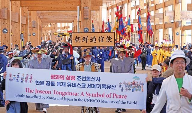 이날 행사는 양국의 역사적인 교류를 상징하는 조선통신사 행렬을 재현하는 것으로 시작됐습니다. 조선통신사는 17세기부터 19세기까지 이어진 한일 간 교류 사절단으로 그 기록물은 유네스코 세계기록유산으로 공동 등재되기도 했습니다. 이번에는 261년 만에 부산과 오사카를 잇는 항로가 재현됐는데 4월 28일 부산항을 출발한 조선통신사선이 오사카에 입항한 것을 기념하는 입항식이 열렸습니다.