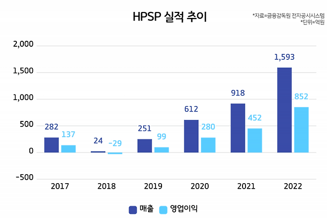 HPSP는 지난 13일 ‘매출액 또는 손익구조 30% 이상 변동’ 공시를 냈습니다. 공시에 따르면 HPSP는 2022년 연결기준 매출 1593억원, 영업이익 852억원, 당기순이익 660억원을 기록했습니다. 각각 전년 대비 73.7%, 88.4%, 86.7% 증가하면서 해당 공시를 낸 겁니다.