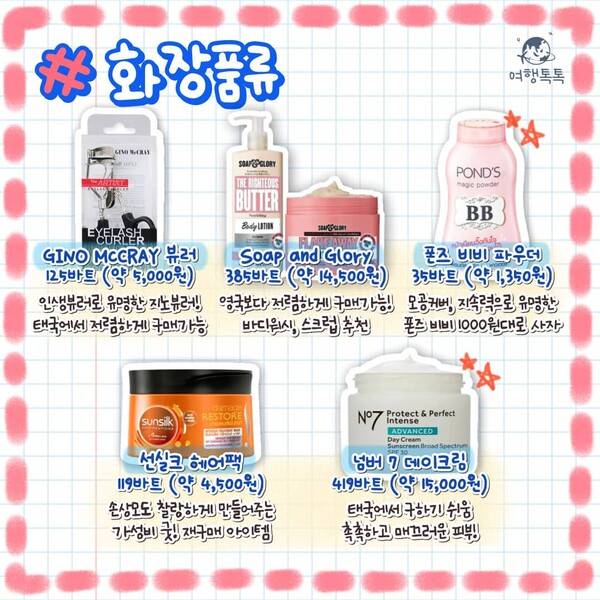 오늘은 이렇게 방콕 필수 쇼핑 리스트 및 인기 쇼핑몰, 쇼핑 팁을 추천 드렸는데요. 기간에 따라 가격에 다소 차이가 있을 수 있지만, 대체로 한국보다 태국에서 저렴하게 구매 가능한 아이템 위주로 소개해드렸으니, 태국 갔을 때 꼭 하나씩 챙겨오시길 바랍니다!