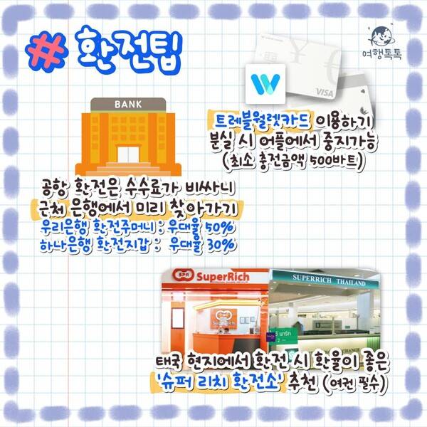 불가피하게 국내 은행을 이용하지 못하셨다면 태국에서 슈퍼 리치 환전소를 이용하실 것을 추천 드립니다. 다른 환전소에 비해 환전소 환율이 좋은 편이기 때문이죠. 단, 여권을 반드시 소지하고 가셔야 합니다.