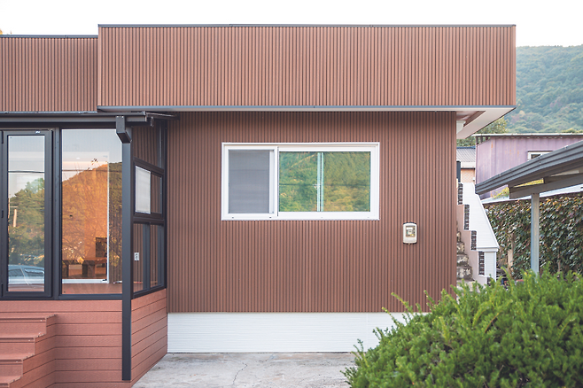 외부 마감재_ 외부 마감재는 합성목재 사이딩과 메탈 사이딩 두 가지 건식 마감재를 혼합해 시공했다. 집의 전면과 우측면은 눈에 잘 띄는 곳이라 합성목재를 사용했고, 잘 보이지 않는 좌측면과 후면은 비용이 저렴하면서 약간의 단열 성능을 가진 메탈 사이딩을 시공했다. 습식이 아닌 건식 마감재를 제안한 이유는 여러 가지 장점이 있기 때문이었다.