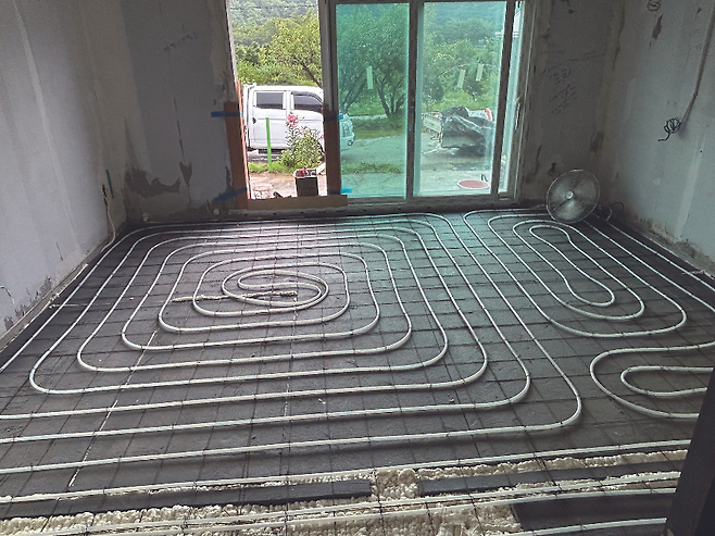바닥 단열 및 신규 난방배관 시공_ 처음 계획은 기존 바닥 난방은 철거한 후 신규 난방배관을 설치하려고 했으나 기존 바닥면 바탕이 잘 보존돼 있어 존치시키고 새로운 난방배관 공사를 마쳤다.