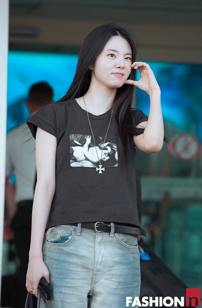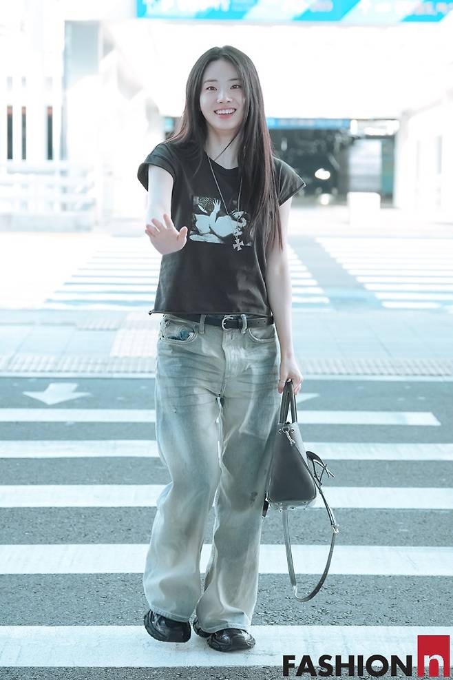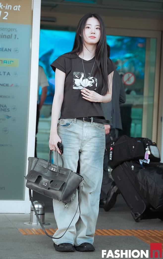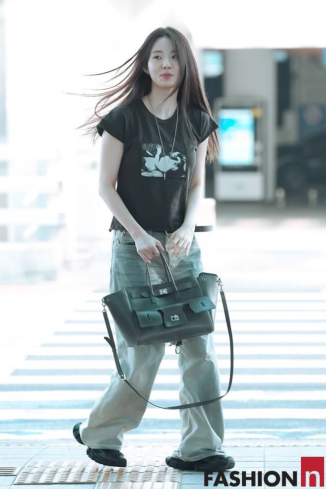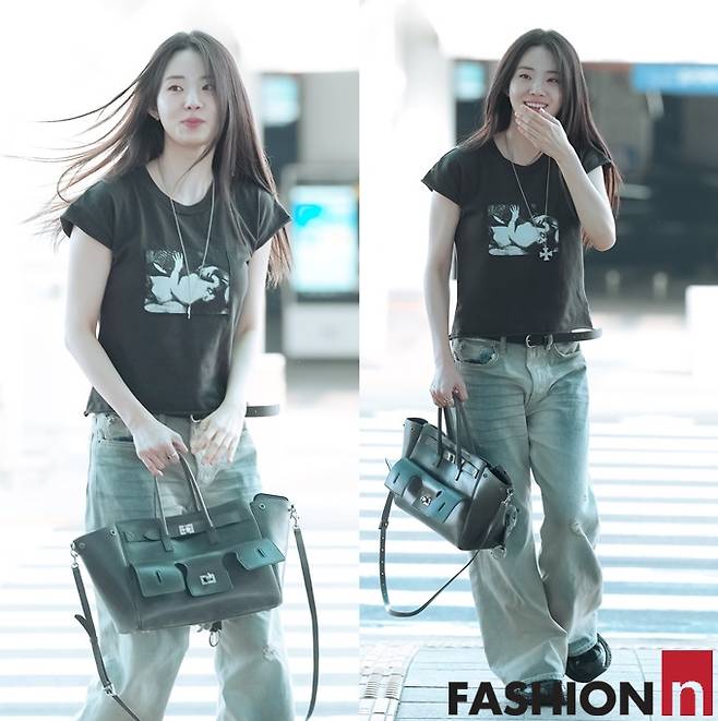 이날 신시아는 머리카락을 휘날리며 워싱 데님 팬츠에 반팔 티셔츠를 착용한 가볍고 편한 스타일러 힙한 출국룩을 선보였다.