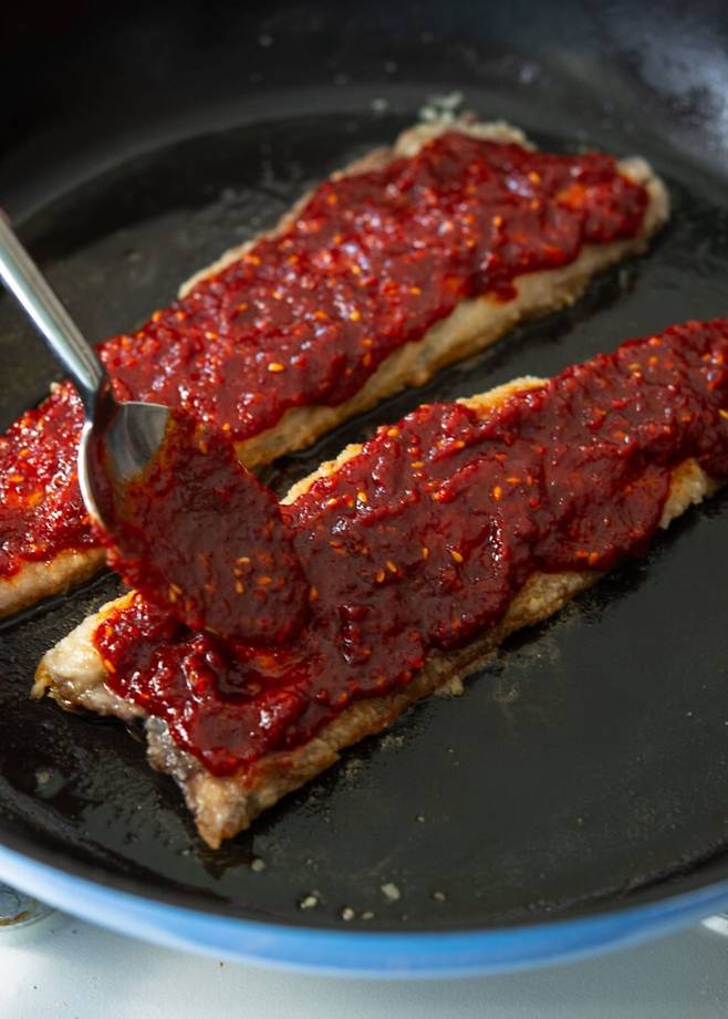 3. 준비한 양념장을 골고루 발라 덮은 뒤, 약불에서 4~5분간 조려 양념이 자작하게 배어들게 한다.
