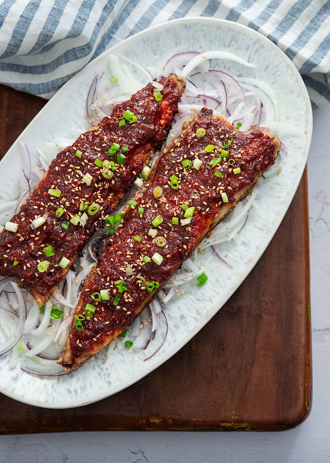 4. 접시에 얇게 썬 양파를 깔고 그 위에 고갈비를 올린 후 대파와 통깨를 뿌려 마무리한다. 따끈한 밥과 함께 낸다.