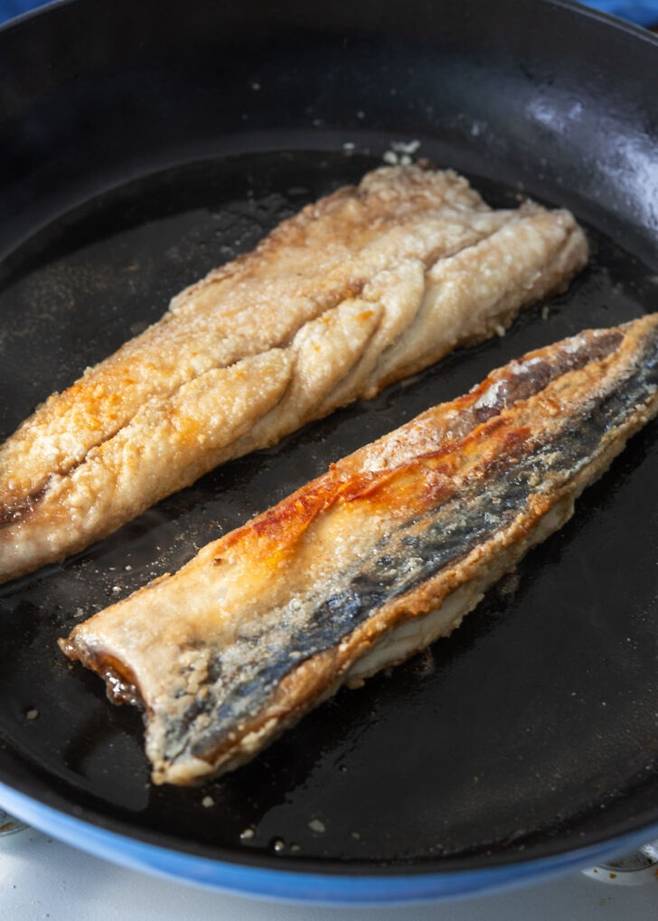 2. 고등어에 옥수수전분을 얇게 입힌다. 팬에 기름을 두르고 중불에서 앞뒤로 노릇하게 3~4분씩 굽는다.