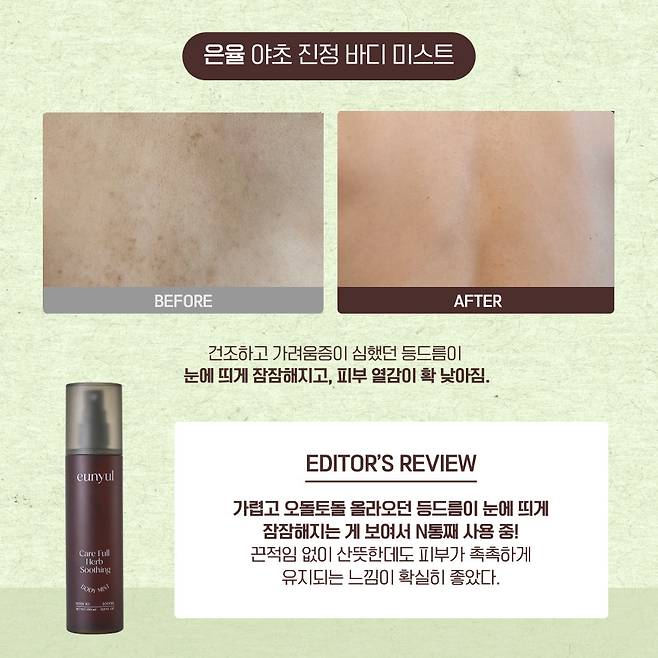 워낙 악건성이라 겨울철엔 건조하다 못해 가려움증도 심했는데, 이번에 사용해 본 은율 야초 진정 바디 미스트를 사용하면서 가려움증이 싹 사라졌어.