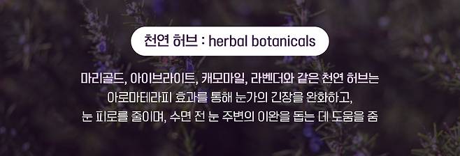 눈 주변의 붉은기 완화, 진정에 도움을 주는 마리골드와 눈의 긴장과 피로를 풀어주고 눈가 뻐근함•건조함을 완화해 주는 데 도움을 주는 아이브라이트, 잔잔한 향과 피부를 편안하게 안정시키는 캐모마일, 릴렉싱의 대표적인 허브 라벤더까지 함유되어 있어.