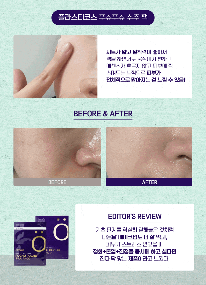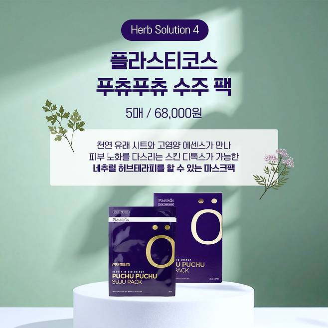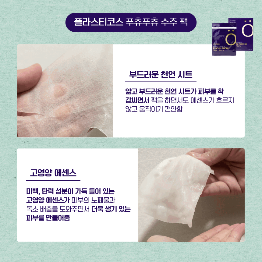 플라스티코스 푸츄푸츄 수주 팩은 내추럴 허브를 중심으로 해 다양한 효능을 선보이는 마스크팩이야.