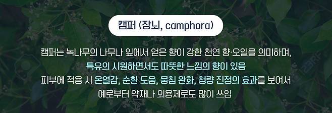 반데르피게 호프밤의 주 성분인 '캠퍼'는 일본, 중국 등지에서 자라는 장뇌나무에서 추출한 고체 결정으로 상쾌하고 시원한 향이 특징이야.