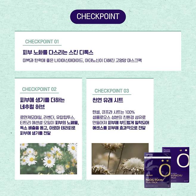 특히 허브와 식물 추출물을 통한 독소 배출, 피부 순환 개선, 항노화, 피부 자생력 효능이 강화된 제품이라 마스크팩 한 번이 주는 저속노화 효과가 큰 팩이야.