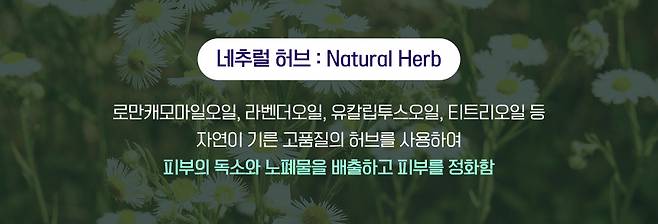 '내추럴 허브'는 식물에서 추출한 자연 유래 성분으로 하나의 허브가 주는 효능이 다양하기 때문에 피부에 다각도에서 다양한 효과를 선사해 줘.