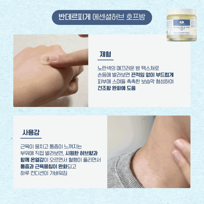 은은한 허브 향이 과하지 않아 더욱 편안하게 사용할 수 있고, 근육통이 있거나 뭉친 바디(Body)에 부드럽게 발라주면, 캠퍼의 포근한 온열감이 순환을 돕고 뭉침을 풀어주고 라벤더 에센셜 오일이 편안한 아로마 릴렉싱을 더해줘.