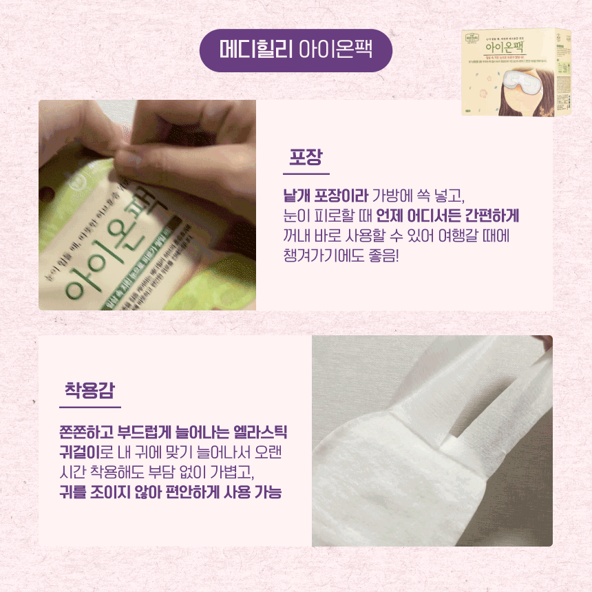 특히 눈이 자주 건조하고 쉽게 피로해지는 편이라 하루가 끝날 때쯤 눈이 뻑뻑하고 초점 맞추기도 힘들었는데, 아이온팩을 올려두면 눈 주위 굳어있던 근육이 풀리는 느낌이 들어 눈 저속노화에도 좋고, 불면증에도 도움을 줘.