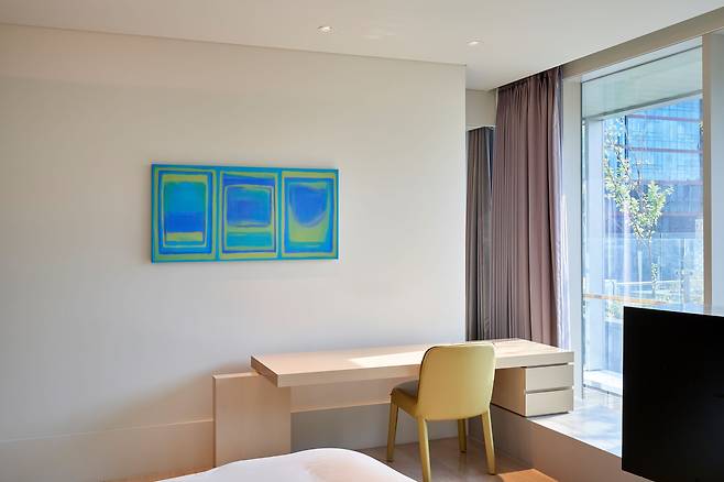 오픈월과 함께 기획하고 선보이는 이번 자선 경매는 이다희 작가의 대표작 ‘푸른 전주곡’ 시리즈 1점과 함께 이다희 작가의 작품들로 꾸며진 안다즈 가든 스위트 객실에서의 1박 혜택이 경매로 진행된다. 해당 객실에는 세계적인 음향 브랜드 뱅앤올룹슨(BANG & OLUFSEN)의 베오랩18(Beolab18, 1500만원 상당)이 비치돼 있어 오감으로 온전히 작품을 경험하기에 안성맞춤이다.