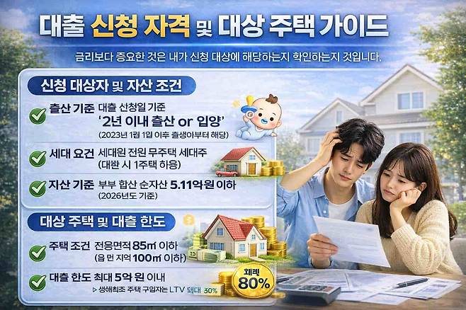 신청 대상은 대출 신청일 기준 2년 이내 출산 또는 입양한 무주택 세대주다. 여기에 부부 합산 순자산 5.11억 원 이하라는 자산 기준이 적용된다.