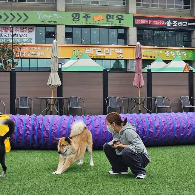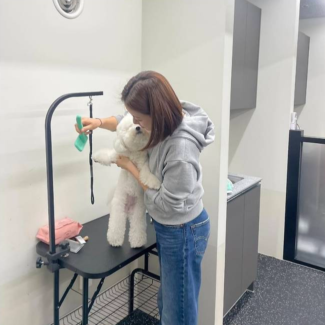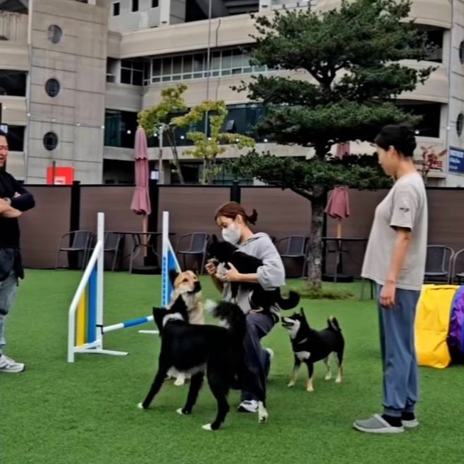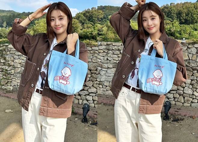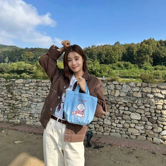 특히 귀여운 레터링과 강아지 일러스트가 그려진 하늘색 토트백은 전체 룩에 발랄한 생기를 더하며 포인트 아이템으로 눈길을 끌었습니다.