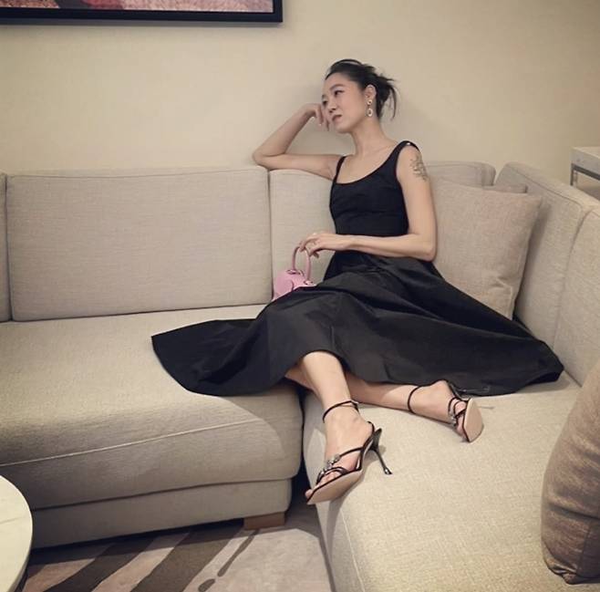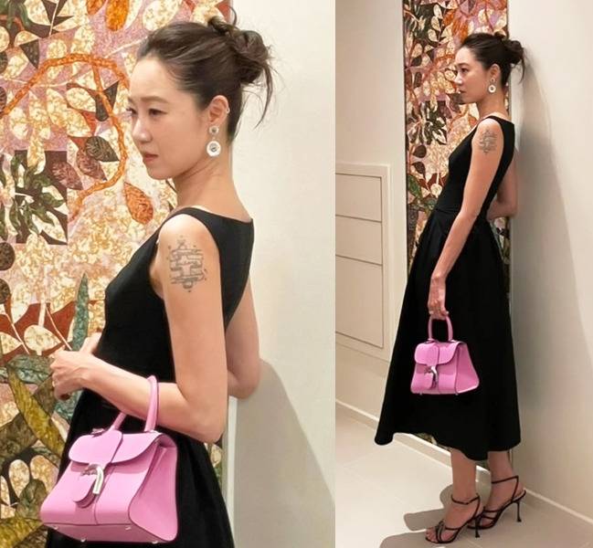 공효진은 깊게 파인 네크라인의 블랙 슬리브리스 드레스에 미니멀한 스트랩 힐을 매치해 우아하면서도 시크한 무드를 자아냈습니다.