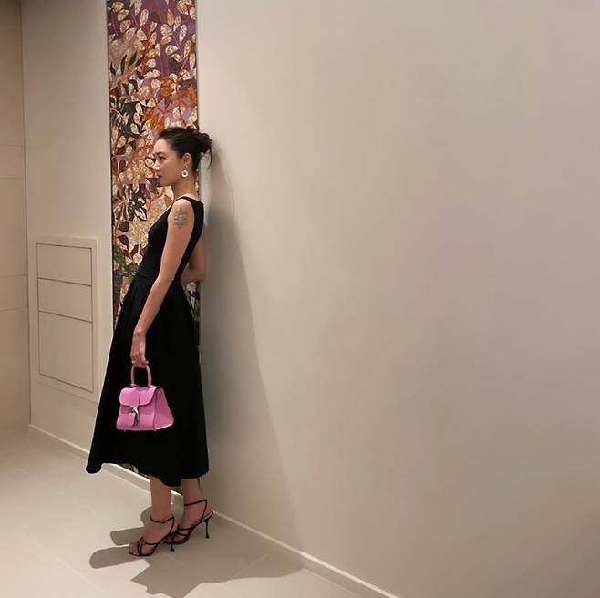 포멀한 블랙 룩에 핑크빛 미니 핸드백을 더해 감각적인 컬러 포인트를 주며, 클래식과 위트의 절묘한 밸런스를 완성했습니다.