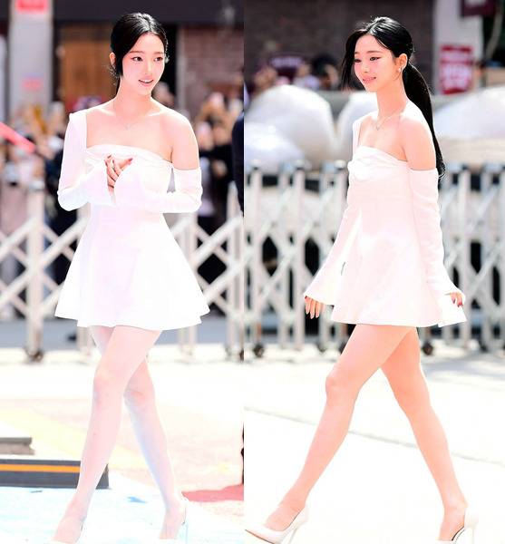 카리나는 맨살이 드러나는 과감한 컷아웃과 풍성한 A라인 실루엣이 조화를 이루며, 단순한 화이트가 아닌 입체적인 라인감을 드러냈습니다.