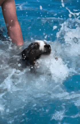 주인의 권유로 수영장에 뛰어든 오스트레일리안 셰퍼드가 뜻밖의 상황에 당황하는 모습이 포착되었습니다.