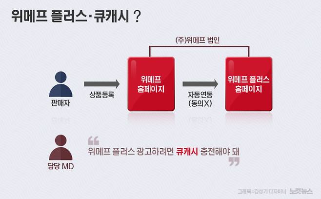 위메프가 판매자들을 대상으로 자사의 해외 직구 사이트인 '위메프플러스'에 광고비로 사용되는 '큐캐시' 구매를 유도해 온 것으로 드러났다. 판매자들의 상품도 위메프플러스에 동의 없이 연동해 게시해 온 것도 밝혀졌다.