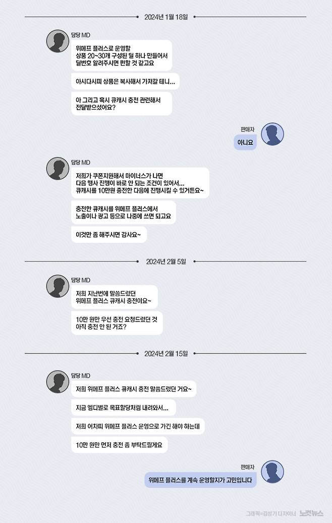 실제 A씨 담당 MD는 지난 1월부터 2월까지 4차례에 걸쳐 큐캐시를 구매해야 한다며 "MD 별로 할당받은 목표량이 있다"고도 말했다. 위메프는 판매자들에게 지속적으로 위메프플러스 서비스 이용을 권유하면서, 큐캐시를 구매해야 한다고도 압박했다.