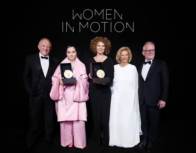 케어링 그룹의 프랑소아 앙리 피노 케이링 그룹 회장, 신인재능상을 받은 말레이시아 아만다 넬 유 감독, '우먼 인 모션'상을 수상한 도나 랭글리 프로듀서, 칸 국제영화제 이리스 크노블로흐 조직위원장과 티에리 프레모 집행위원장.(왼쪽부터)