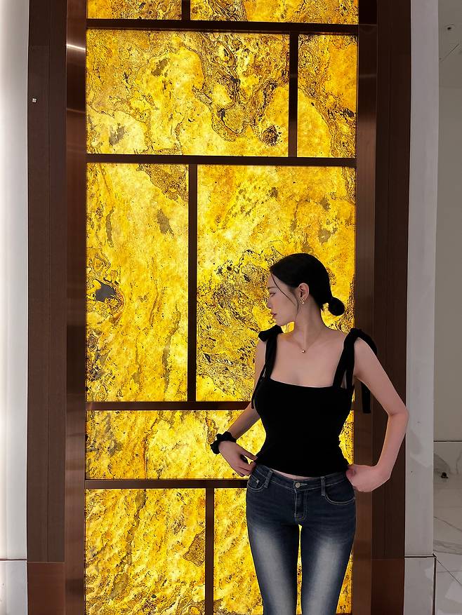 로우진에 크롭 기장의 밑단 굴림 상의를 매치하면 허리라인을