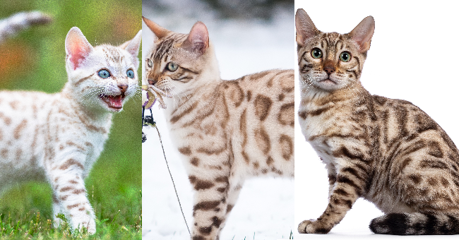 스노우 뱅갈의 털색과 무늬에 따라 크게 세 가지로 나뉘어요. 스노우 뱅갈은 샴이나 버미즈 고양이에게서 태어난 고양이로, 부모 고양이에 따라 털색과 무늬가 조금씩 달라집니다.
